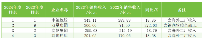 表6 2024年度中國輪胎企業(yè)排行榜前10強情況