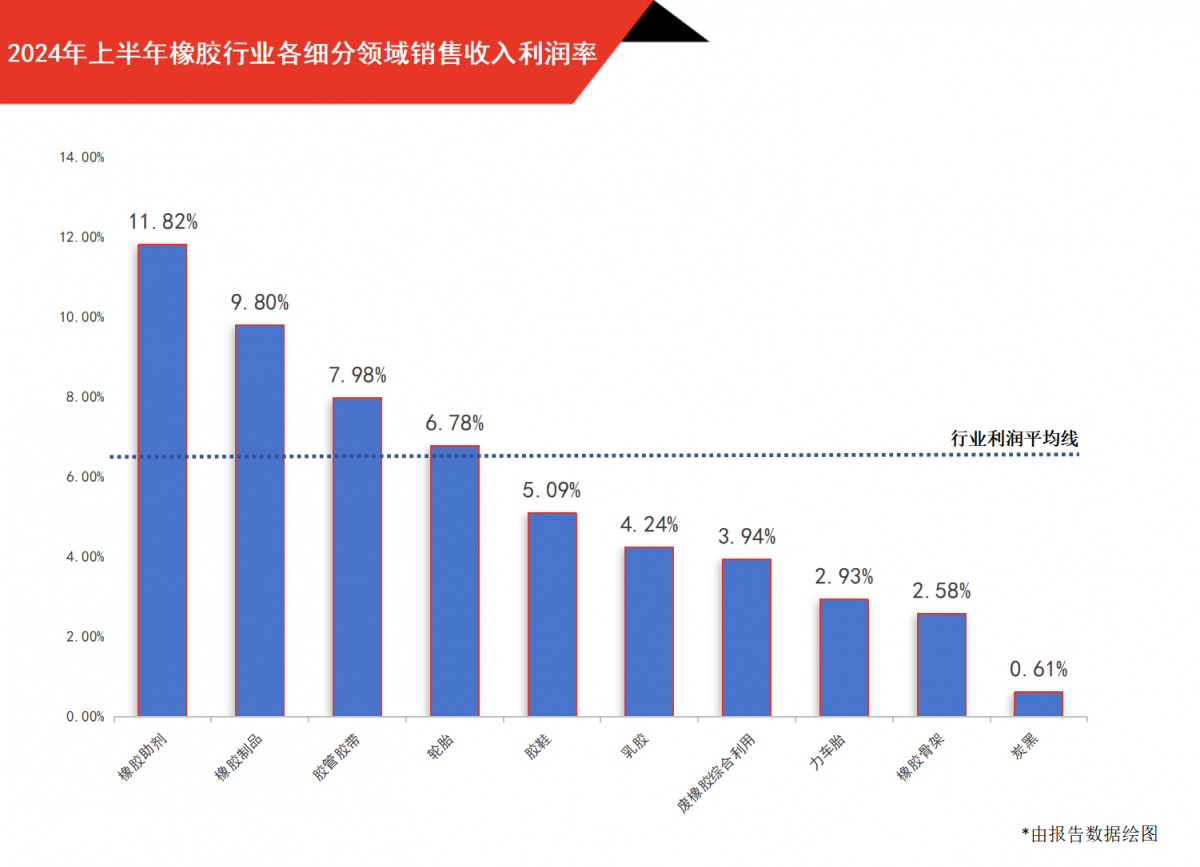 但炭黑的的銷售收入利潤率在橡膠行業(yè)的眾多細(xì)分領(lǐng)域中持續(xù)墊底,拖累了橡膠行業(yè)整體發(fā)展。從2024年上半年看,橡膠行業(yè)的平均利潤率為6.19%,而炭黑僅為0.61%,差距較大。