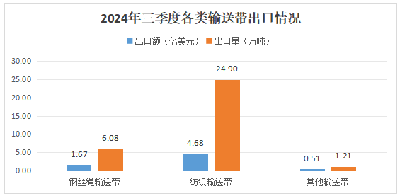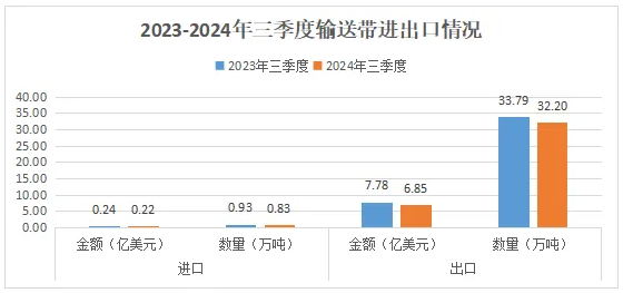 2024年三季度我國輸送帶出口總量下降4.72%至32.2萬噸,出口總額下降11.89%至6.85億美元,出口均價下降7.52%至2129美元/噸。