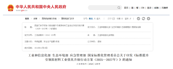 2024年12月13日,工業(yè)和信息化部、生態(tài)環(huán)境部、應(yīng)急管理部、國(guó)家標(biāo)準(zhǔn)化管理委員會(huì)聯(lián)合印發(fā)《標(biāo)準(zhǔn)提升引領(lǐng)原材料工業(yè)優(yōu)化升級(jí)行動(dòng)方案(2025—2027年)》。