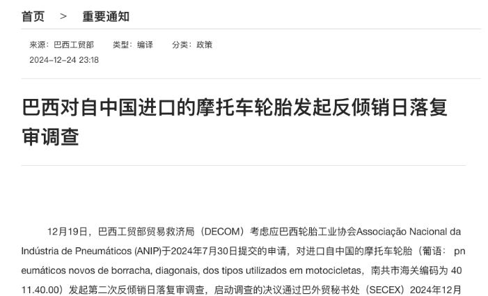 近日,巴西輪胎工業(yè)協(xié)會(ANIP)于2024年7月30日提出申請,要求對進(jìn)口自中國的摩托車輪胎(南共市海關(guān)編碼4011.40.00)進(jìn)行第二次反傾銷日落復(fù)審調(diào)查。隨后,商務(wù)部于2025年1月6日發(fā)布消息,巴西外貿(mào)秘書處已在去年12月19日的官方日報上發(fā)布了2024年第76號公告,正式宣布對來自中國、泰國、越南的摩托車輪胎啟動反傾銷日落復(fù)審調(diào)查。此次傾銷調(diào)查覆蓋了2023年4月至2024年3月的時間段,而損害分析期則追溯至2019年4月至2024年3月。