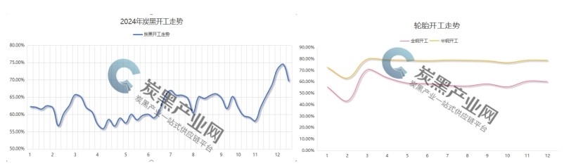 據(jù)炭黑產(chǎn)業(yè)網(wǎng)監(jiān)測,2024年炭黑開工在55%-76%之間,平均為62.53%,整體上行業(yè)開工處于相對高位。而輪胎廠的開工情況在春節(jié)前后出現(xiàn)了較大的波動,但全年整體來看保持相對穩(wěn)定。其中,全鋼胎的平均開工率為58.11%,半鋼胎的平均開工率則為76.11%。