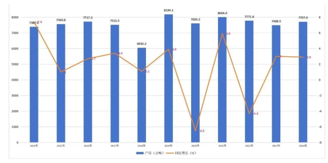 據(jù)國家統(tǒng)計局數(shù)據(jù),2024年全國塑料制品行業(yè)匯總統(tǒng)計企業(yè)完成產(chǎn)量7707.6萬噸,同比增長2.9%。產(chǎn)量進一步向疫情前水平邁進。單就產(chǎn)量增長率而言,仍有較大上升潛力。2014-2024年我國塑料制品產(chǎn)量及增長率見圖1。