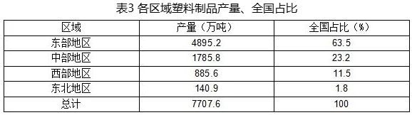 從區(qū)域情況來看,2024年,東部十省區(qū)(統(tǒng)計數(shù)據(jù)未含港澳臺地區(qū)產(chǎn)量)塑料制品產(chǎn)量4895.2萬噸,同比增長3.3%,全國占比63.5%,較2023年全國占比增長0.2個百分點;中部六省塑料制品產(chǎn)量1785.8萬噸,同比增長19.9%,全國占比23.2%,全國占比較2023年增長3.3個百分點;西部十二省區(qū)塑料制品產(chǎn)量885.6萬噸,同比下降20.2%,全國占比11.5%,較2023年全國占比下降3.2個百分點;東北三省塑料制品產(chǎn)量140.9萬噸,同比下降7.3%,全國占比1.8%,較2023年全國占比下降0.2個百分點。詳見表3。