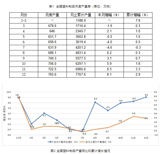 2024年1-12月,全國(guó)塑料制品行業(yè)產(chǎn)量7707.6萬(wàn)噸,同比增長(zhǎng)2.9%。