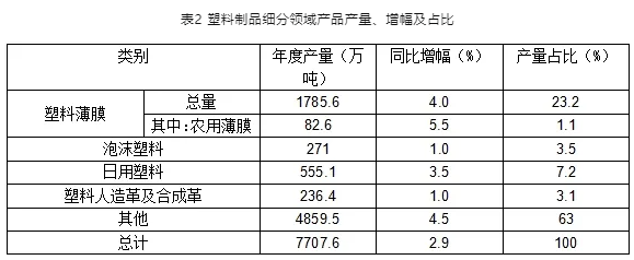 具體到塑料制品的各細(xì)分領(lǐng)域,包括塑料板管型材、塑料絲繩及編織品、塑料包裝箱及容器、塑料零件及其他塑料制品類別的產(chǎn)量為4859.5萬(wàn)噸,占比高達(dá)63%。占比第二位是塑料薄膜,產(chǎn)量1785.6萬(wàn)噸,占比23.2%;其中農(nóng)用薄膜產(chǎn)量為81.6萬(wàn)噸,同比增長(zhǎng)5.5%。此外,泡沫塑料產(chǎn)量同比增長(zhǎng)1.0%,日用塑料產(chǎn)量同比增長(zhǎng)3.5%,塑料人造革及合成革產(chǎn)量同比增長(zhǎng)1.0%。