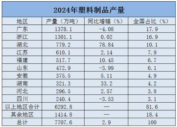 2024年全國塑料制品總產(chǎn)量7707.6萬噸 廣東省排名第一