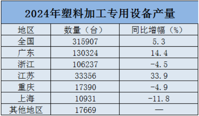 從我國塑料加工專用設(shè)備來看,產(chǎn)能主要集中在東部地區(qū),廣東與浙江兩省產(chǎn)量占據(jù)全國產(chǎn)量的七成以上。2024年,在大規(guī)模設(shè)備更新行動方案等政策以及出口增長影響下,全國塑料加工專用設(shè)備產(chǎn)量有所提升,同比增長5.3%。