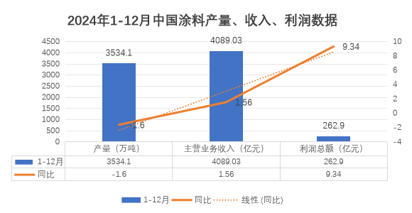 經(jīng)中國涂料工業(yè)協(xié)會統(tǒng)計,2024年,中國涂料行業(yè)總產(chǎn)量3534.1萬噸,較上年同期同比降低1.60%,主營業(yè)務(wù)收入總額4089.03億元,較上年同期同比增長1.56%,利潤總額262.9億元,較上年同期同比增長9.34%。