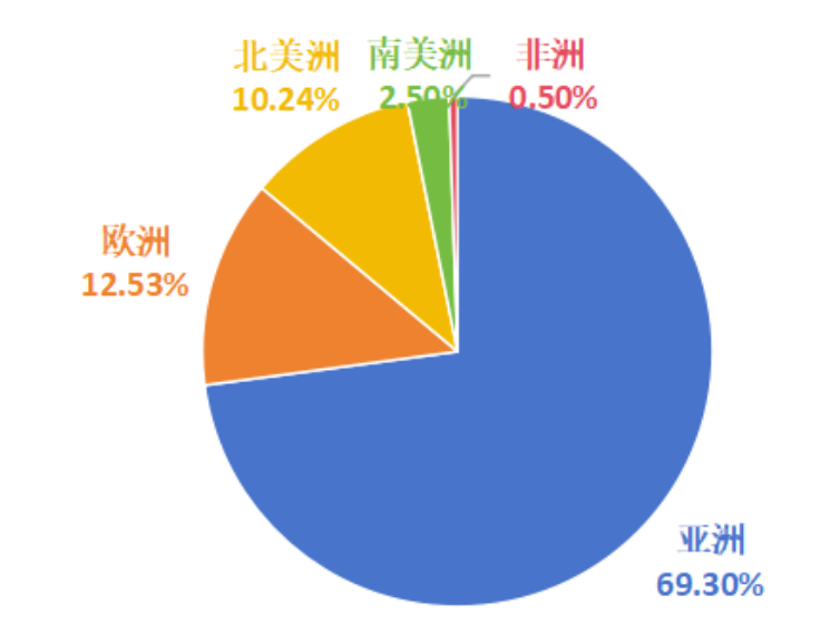 —促進(jìn)劑共出口到110多個(gè)國(guó)家地區(qū),其中前30個(gè)國(guó)家地區(qū)出口量占比為92.8%,亞洲、歐洲、北美洲出口量占比為81.9%。