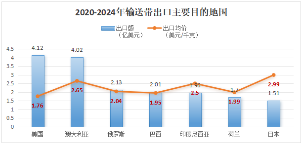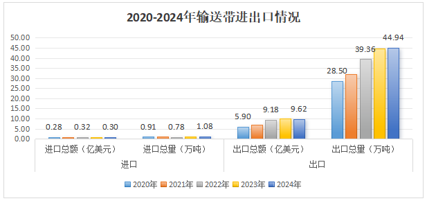 2020-2024年我國(guó)輸送帶出口總額分別為5.90億美元、6.91億美元、9.18億美元、10.08億美元和9.62億美元;出口總量分別為28.50萬(wàn)噸、31.96萬(wàn)噸、39.36萬(wàn)噸、44.51萬(wàn)噸和44.94萬(wàn)噸,出口量均再創(chuàng)歷史新高;出口均價(jià)分別為2.07美元/千克、2.16美元/千克、2.33美元/千克、2.27美元/千克和2.14美元/千克。