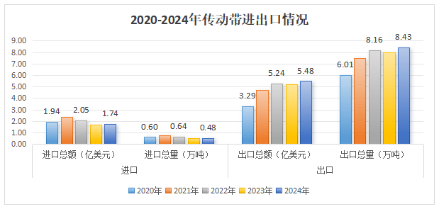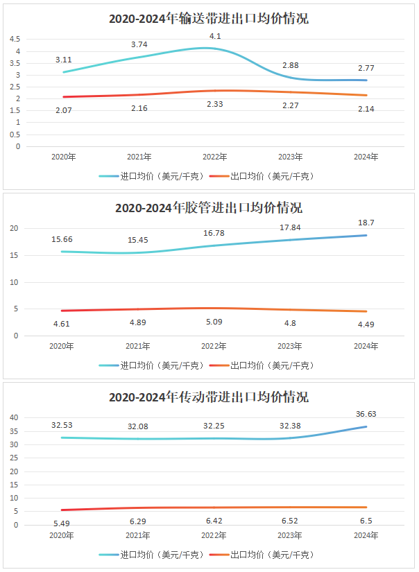 通過(guò)2020-2024年輸送帶、膠管和傳動(dòng)帶進(jìn)出口市場(chǎng)的不同表現(xiàn),可以體現(xiàn)出輸送帶、膠管和傳動(dòng)帶三個(gè)行業(yè)各自的一些特點(diǎn):