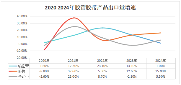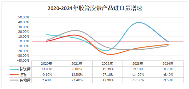 從2020-2024年進(jìn)出口總量的增長(zhǎng)速度來(lái)看,我國(guó)膠管膠帶產(chǎn)品的進(jìn)口在多數(shù)年份處于下降態(tài)勢(shì),尤其是自2022年開始,進(jìn)口降幅進(jìn)一步擴(kuò)大(注:據(jù)了解,2023年輸送帶產(chǎn)品進(jìn)口中包括了廢舊輸送帶進(jìn)口,因此呈現(xiàn)波動(dòng)性增長(zhǎng),但不具代表性),膠管和傳動(dòng)帶兩類產(chǎn)品在2022-2024年連續(xù)三年進(jìn)口出現(xiàn)下降。