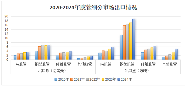 2020-2024年我國(guó)膠管產(chǎn)品中第一大出口類型是鋼絲膠管,出口額占膠管出口總額約42%-48%,出口量占膠管出口總量約52%-60%,同時(shí)鋼絲膠管也是所有出口膠管類型中均價(jià)最低的類型,近些年出口占比呈現(xiàn)下降趨勢(shì);純膠管與纖維膠管出口額各占出口總額大約20%-25%,出口量各占出口總量大約16%-18%,出口均價(jià)在膠管產(chǎn)品細(xì)分領(lǐng)域較高,兩類產(chǎn)品出口份額近幾年變化不大;其他膠管類占比較少,但出口額和出口量占比逐年攀升,2024年均占到了的膠管總出口10%以上。