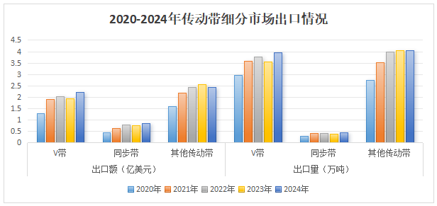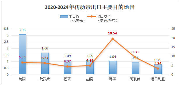 2020-2024年我國(guó)傳動(dòng)帶出口市場(chǎng)中均價(jià)最高的是同步帶產(chǎn)品,均價(jià)達(dá)19美元/千克左右,且出口額占比逐年提高,但其出口額只占傳動(dòng)帶出口總額約13%-15%,出口量只占傳動(dòng)帶出口總量約5%,而出口均價(jià)在6美元/千克左右的三角帶及其他傳動(dòng)帶出口額占了出口總額約85%左右,出口量幾乎占了出口總量的約95%。