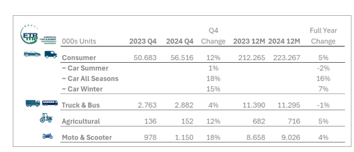 在進(jìn)口市場(chǎng)方面,2024年前11個(gè)月,歐洲(包括歐盟27國和英國)乘用車和輕型卡車輪胎的進(jìn)口量大幅增長(zhǎng)了17%,與2019年同期相比更是激增了27%。這一增長(zhǎng)主要得益于來自中國、韓國和印度等亞洲國家的進(jìn)口輪胎。其中,中國輪胎的進(jìn)口量同比增長(zhǎng)了17%,自2019年以來更是增長(zhǎng)了超過50%,額外增加了3800萬條。韓國和印度輪胎的進(jìn)口量也分別實(shí)現(xiàn)了32%和30%的同比增長(zhǎng),顯示出亞洲輪胎在歐洲市場(chǎng)的強(qiáng)勁競(jìng)爭(zhēng)力。