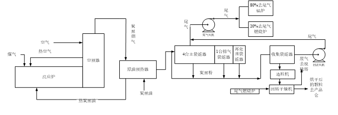 炭黑軟質(zhì)生產(chǎn)線將預先配制好的原料油送入炭黑反應爐,產(chǎn)生的炭黑煙氣經(jīng)主袋濾器進行分離成尾氣和粉狀炭黑。尾氣加壓風機將分離出的80%尾氣送至尾氣鍋爐產(chǎn)蒸汽,20%尾氣送至尾氣燃燒爐用于濕法造粒的干燥熱源。主袋濾器分離出的粉狀炭黑和排氣袋濾器、再處理袋濾器分離出來的粉狀炭黑,通過風送風機送至收集袋濾器,收集袋濾器通過風送風機和回流風機的壓差控制,將粉狀炭黑送至粉罐、造粒機和干燥機,干燥機為回轉(zhuǎn)式干燥機,尾氣燃燒爐燃燒后產(chǎn)生的煙氣,大部分通過回轉(zhuǎn)干燥機火箱,由脫硝風機送至脫硫塔,少部分直接與干燥機內(nèi)的炭黑顆粒進行逆流換熱,濕氣經(jīng)排氣袋濾器過濾后送至脫硫塔。最終烘干后的炭黑顆粒經(jīng)篩選、除鐵屑后送至產(chǎn)品倉。工藝圖見圖1。