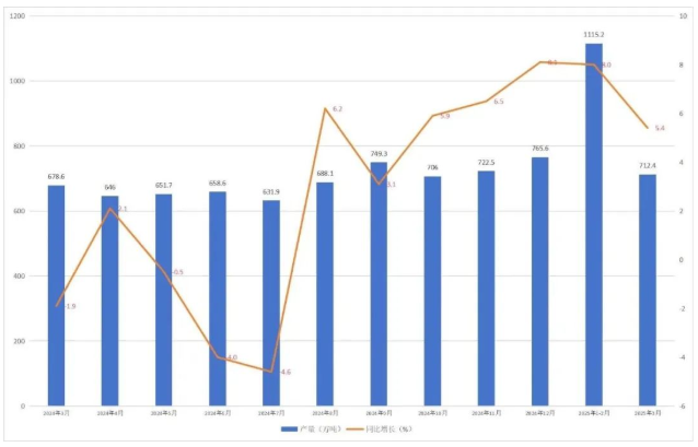 圖1:2024年3月-2025年3月塑料制品產(chǎn)量趨勢(shì)圖