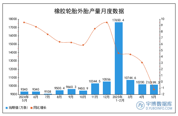 2025年5月全國橡膠輪胎外胎產(chǎn)量10199.3萬條,同比下降1.2%,2025年1-5月全國橡膠輪胎外胎產(chǎn)量為48896.2萬條,累計增長2.8%。