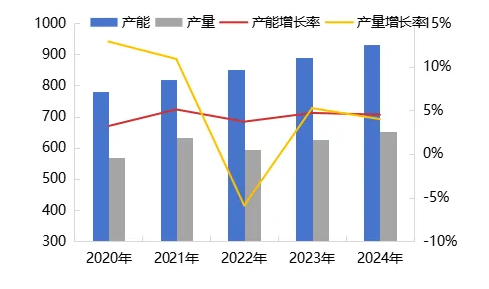 根據(jù)數(shù)據(jù)來看,炭黑行業(yè)產(chǎn)能處于穩(wěn)步增長(zhǎng)趨勢(shì),2024年中國(guó)炭黑產(chǎn)能為913萬噸,同比增長(zhǎng)2.93%,五年年復(fù)合增長(zhǎng)率為2.84%;但近五年炭黑行業(yè)的產(chǎn)量、產(chǎn)能利用率并未有顯著的增長(zhǎng)趨勢(shì),甚至在2022年出現(xiàn)了下滑。供需矛盾持續(xù)影響行業(yè)產(chǎn)能釋放,產(chǎn)能利用率近五年一直維持在6成左右,外加新增產(chǎn)能的釋放進(jìn)一步加劇供需矛盾,未來行業(yè)產(chǎn)能利用率提升空間仍然有限。