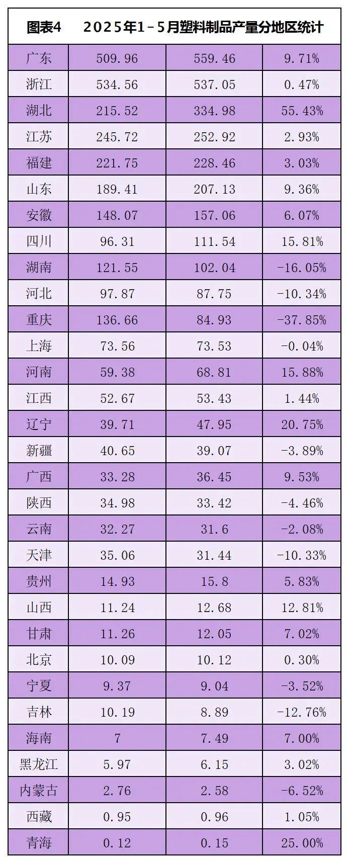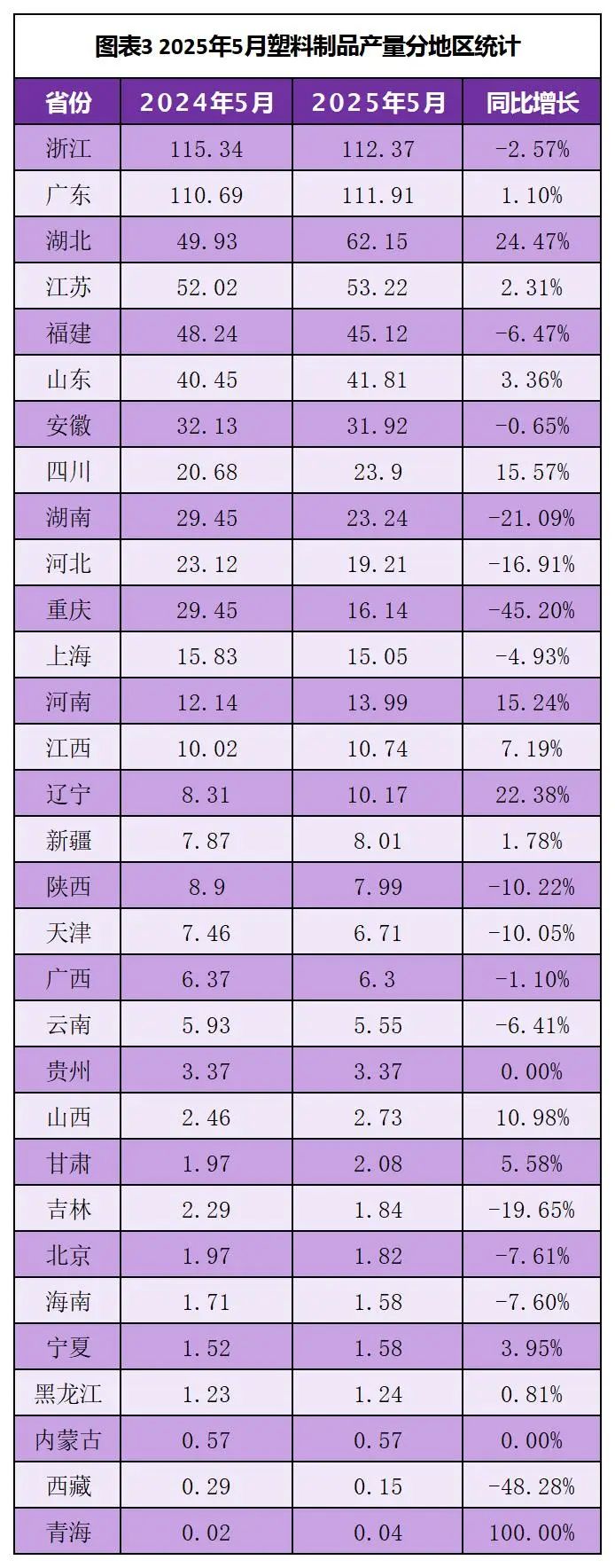 2025年5月,在統(tǒng)計(jì)的31個(gè)省市中,有13個(gè)省市塑料制品產(chǎn)量同比增長(zhǎng),湖北和遼寧增長(zhǎng)超過20%。排名前十的省份分別是浙江、廣東、湖北、江蘇、福建、山東、安徽、四川、湖南、河北,總產(chǎn)量524.85萬噸,占全國(guó)的81.69%。浙江產(chǎn)量排名第一,產(chǎn)量112.37萬噸,同比下降2.57%。