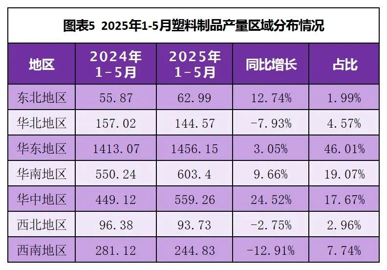 1-5月,華東地區(qū)以1456.15萬噸的產(chǎn)量位居榜首,占總產(chǎn)量的46.01%,顯示出其在塑料制品生產(chǎn)方面的絕對(duì)優(yōu)勢(shì)。東北地區(qū)產(chǎn)量為62.99萬噸,占總產(chǎn)量的1.99%,是產(chǎn)量最低的區(qū)域。華東、華南和華中地區(qū)合計(jì)占總產(chǎn)量的82.75%,是塑料制品生產(chǎn)的主要集中地。