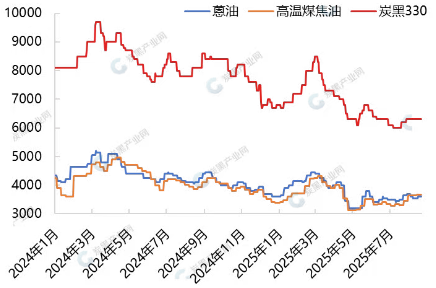 2024-2025年炭黑與原料油價格走勢對比圖