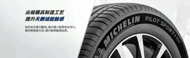 米其林在輪胎“黑”的探索上同樣成果斐然。其曜黑工藝運用鉆石光源反射原理,造就出高端優(yōu)雅的深黑效果。該原理讓胎側(cè)吸收更多光線、減少反射,使黑度更接近純黑,盡顯獨特高端。胎側(cè)的黑白方格旗圖案會隨光線移動產(chǎn)生漸變視覺效果,靈動非凡。尖端模具制造工藝賦予胎側(cè)天鵝絨般的觸感,納米技術(shù)激光雕刻通過縮小胎側(cè)條紋設(shè)計,打造高黑度光阱,進一步提升胎側(cè)觸感品質(zhì)。