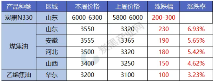 節(jié)前煤焦油的超預期上行,乙烯焦油同樣上調(diào),炭黑廠家成本繼續(xù)升高。部分炭黑廠反應迅速,停止對外報價,后報價上調(diào)200-300元/噸。