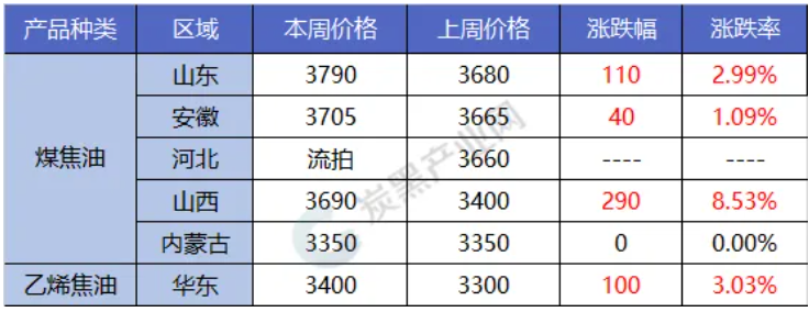 相關(guān)產(chǎn)品乙烯焦油,近期由于消費(fèi)稅問題,部分企業(yè)已經(jīng)開始含消費(fèi)稅拍賣,但主要供應(yīng)企業(yè)對于是否自用不外售尚未商定表態(tài),后續(xù)炭黑產(chǎn)業(yè)網(wǎng)也會持續(xù)跟蹤。目前華東地區(qū)乙烯焦油漲至3400元/噸。