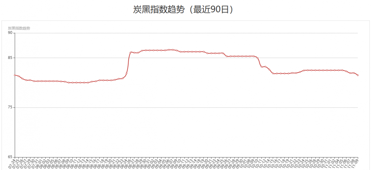 炭黑產(chǎn)業(yè)網(wǎng)根據(jù)市場(chǎng)N330/N220/N550三個(gè)牌號(hào)最新市場(chǎng)成交價(jià)格,并分別按一、二、三線品牌權(quán)重分配計(jì)算后得出今日最新炭黑指數(shù)為81.49,與之前相比炭黑指數(shù)依然維持在下行區(qū)間。