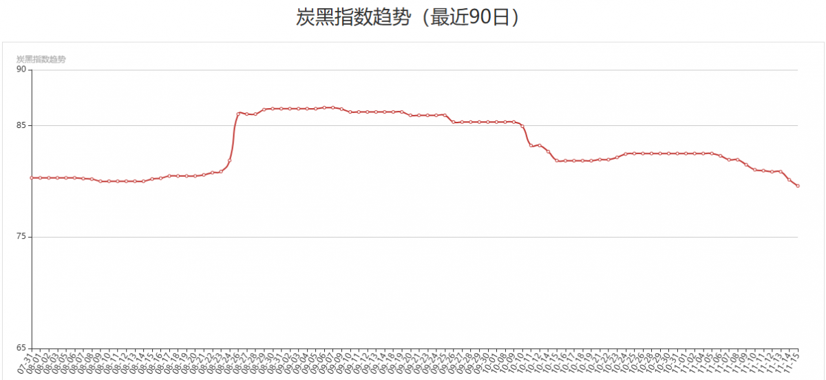 炭黑產(chǎn)業(yè)網(wǎng)根據(jù)市場(chǎng)N330/N220/N550三個(gè)牌號(hào)最新市場(chǎng)成交價(jià)格,并分別按一、二、三線品牌權(quán)重分配計(jì)算后得出今日最新炭黑指數(shù)為81.49,與之前相比炭黑指數(shù)依然維持在下行區(qū)間。