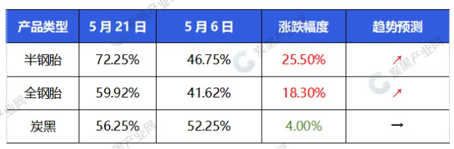 五一假期之后,輪胎廠開工逐漸恢復(fù)提升,從開工數(shù)據(jù)來看,較五一假期半鋼胎開工率增長25.5%,全鋼胎開工率增長18.3%,下游開工不斷回升帶動(dòng)原料消耗量增加。且炭黑價(jià)格已處于近兩年來價(jià)格歷史低位,輪胎企業(yè)抄底采買下單,主力下游的集中采購下單,直接使得炭黑廠完成去庫存,市場庫存降到合理位置。外加政策面消息下,對整個(gè)產(chǎn)業(yè)鏈來說,最先受到利好的就是輪胎行業(yè),需求端對未來市場信心的轉(zhuǎn)好,也帶動(dòng)了入市詢盤采買。