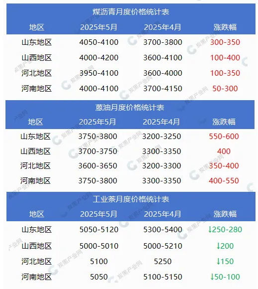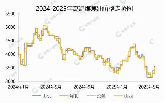 5月高溫煤焦油跌至低位后寬幅回調(diào),較上月漲幅在170-405元/噸。