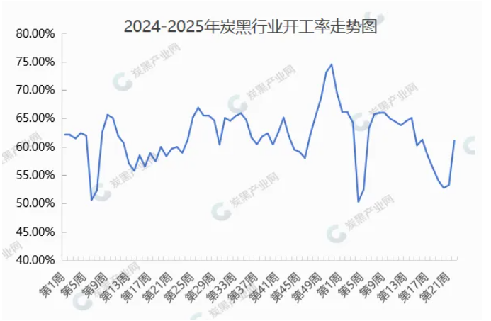 5月炭黑較上月月底價(jià)差在500元/噸,月均行業(yè)開工負(fù)荷為58.61%,較上月增加6.17%。